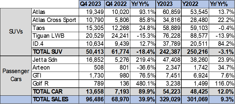 El crecimiento fue impulsado en gran medida por el aumento de las ventas del ID.4 un 84,2 % interanual, así como por las ventas de Atlas un 13,7 % interanual y las de Atlas Cross Sport un 22,2 % interanual. Las ventas de Jetta crecieron un 23,9% interanual.